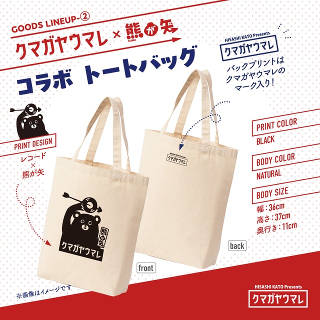 【直筆サイン入りミニ色紙プレゼント対象商品 ※数量限定】 ※お一人様1枚限定となります。(複数商品・複数枚購入の場合も1枚) レコードを持った熊が矢のイラストを大きくプリント! バックプリントには『クマガヤウマレ』のマーク入り! - introduction - 熊谷市出身アーティスト結成された『クマガヤウマレ/ 加藤ひさしとバーティー・トゥモルタンス」と 熊谷市シティプロモーションの一環として誕生した ゆるさがかわいいキャラクター『熊が矢』が まさかのコラボレーション! サイズ:本体/W36×H37×D11(cm) 持手/2.5×47(cm) 素材:綿100% ※キャンバス 内容量:10ℓ ※プリント部分への強い摩擦やアイロンは避けてください。 ※裏返してネットに入れて洗濯し、陰干ししてください。 ※漂白剤、乾燥機の使用不可。 ※長時間水に浸けたり、濡れたまま放置しないでください。 【ご注意】 ・在庫がない商品・サイズは予約注文となります。 ・大量注文時は在庫の有無に関わらず、発送にお時間をいただく場合がございます。
